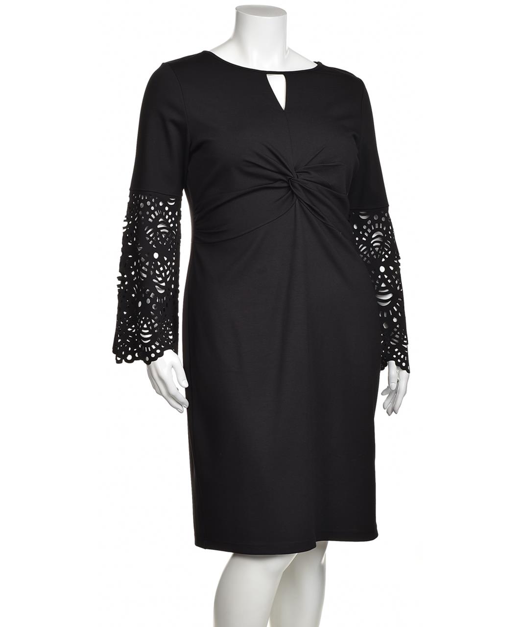 Елегантна рокля от вискоза в черно с прилепнала кройка, възел отпред и малък прорез на деколтето. Дълги ръкави с ажурни мотиви. Комфортна и подходяща за официални поводи. Подходяща за работа и събития