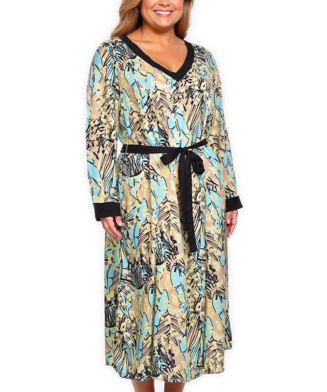 Рокля от вискоза с дълги ръкави и елегантен принт. Съчетание от жълти, сини и черни нюанси с контрастиращи черни маншети и V-образно деколте. Акцент е черният колан, подчертаващ талията.