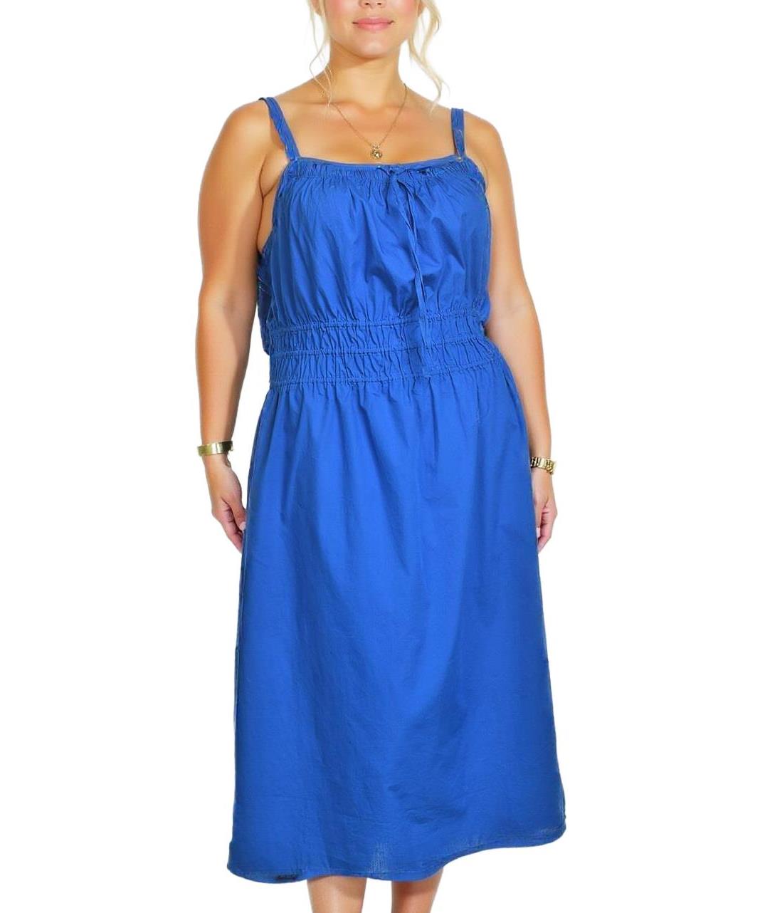 Лятна рокля от памук в яркосин цвят. Моделът е с тънки презрамки и еластичен колан на талията за удобно носене. Идеален избор за ежедневни и летни облекла.