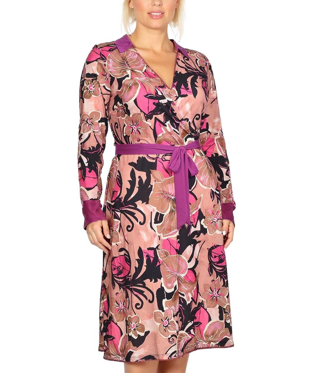 Свежа рокля с флорални мотиви в розови и черни нюанси. Има дълги ръкави и акцентен лилав колан на талията. Подходяща за ежедневно носене или специални поводи, предлага комфорт и стил.