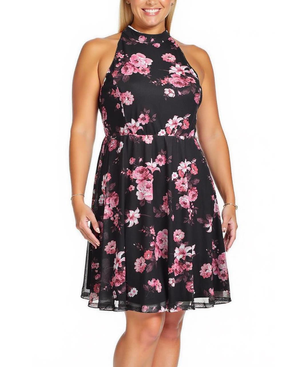 Черна рокля със средна дължина и флорален мотив в розови нюанси. Дизайнът е без ръкави, с високо деколте и разкроена пола, което придава елегантен и женствен вид. Подходяща за различни поводи.