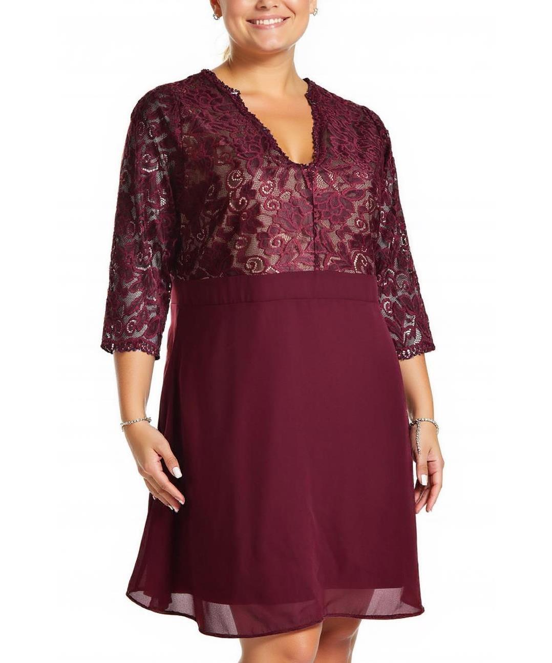 Елегантна рокля в бордо с дантелена горна част и 3/4 ръкави. Моделът е с V-образно деколте, което придава стил и изисканост. Изработена е от лека и комфортна материя, подходяща за специални поводи.