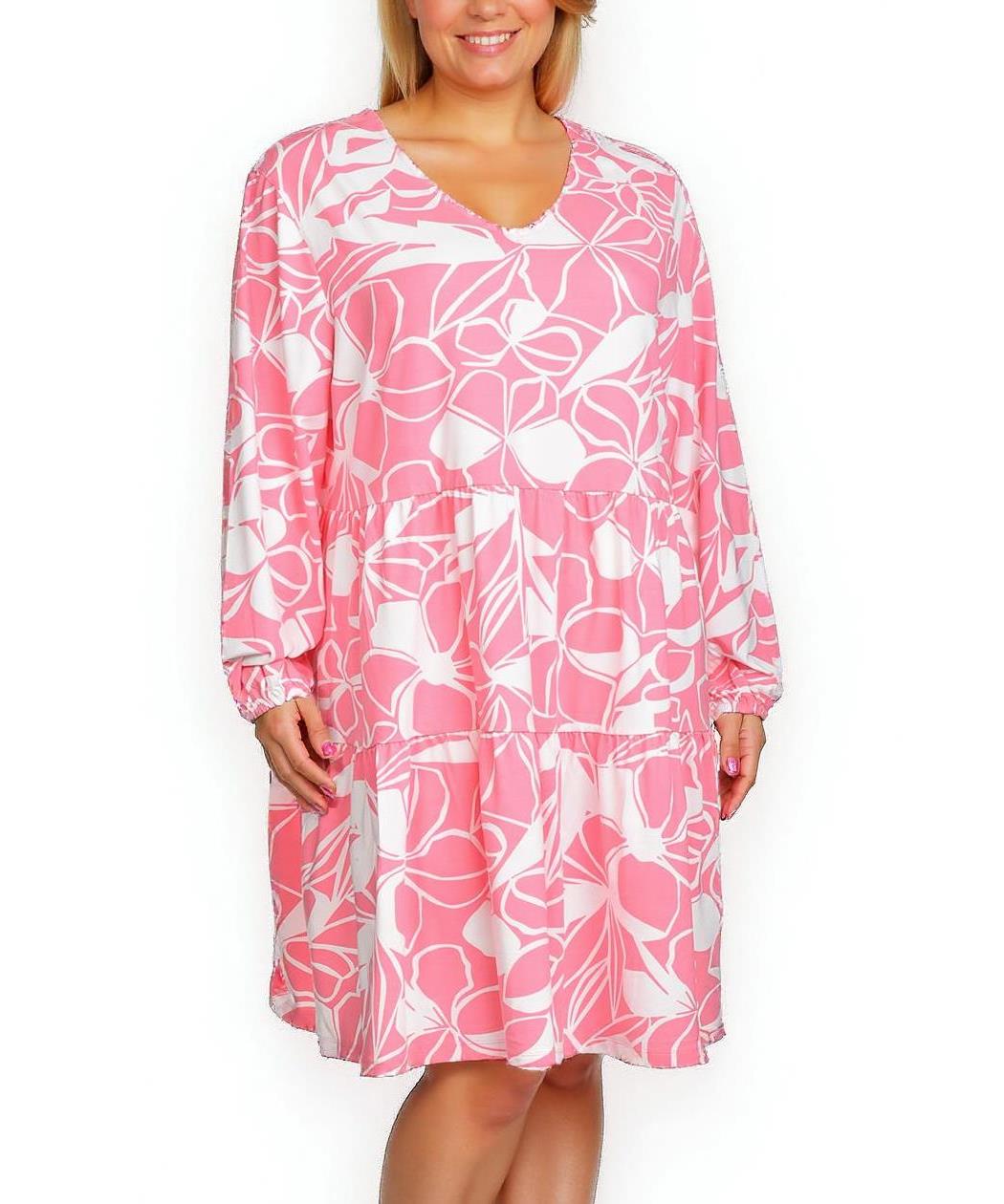 Рокля от памук, с розов и бял флорален принт. В свободен стил, с дълги ръкави и V-образно деколте. Подходяща за ежедневна употреба или неформални събития, предлагаща комфорт и стил.