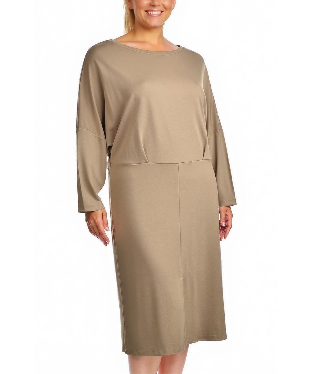 Рокля от вискоза в бежово: midi дължина, прав силует, свободен горен край с паднали ръкави и лодка деколте. Мека, дишаща материя, подходяща за всеки ден и работно облекло. Стилна линия, лесна поддръж.
