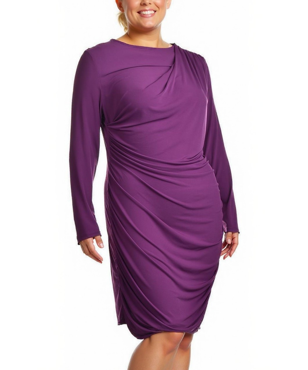 Елегантна лилава рокля до коляното с дълги ръкави и ефектни драпировки, която подчертава силуета. Еластична, удобна и стилна — перфектна за официални поводи и вечерни излизания. Подходяща и за офиса.
