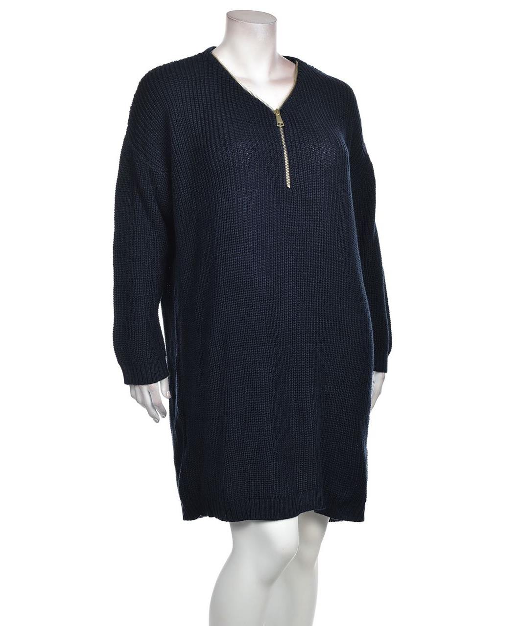 Топла плетена рокля в наситено тъмносиньо с прав, свободен силует за ежедневен стил. Дълги ръкави, ребрени маншети и подгъв, V-деколте с елегантен златист цип. Комфорт и изисканост. Практична и стилна