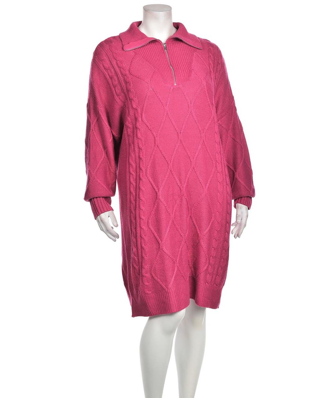 Рокля-пуловер в циклама със стилизирани оплетки и 1/4 цип на яка. Свободен силует, дълги ръкави с маншети и ластична долна част. Топла и удобна, идеална за есенно-зимни визии. Подходяща за подарък!!.