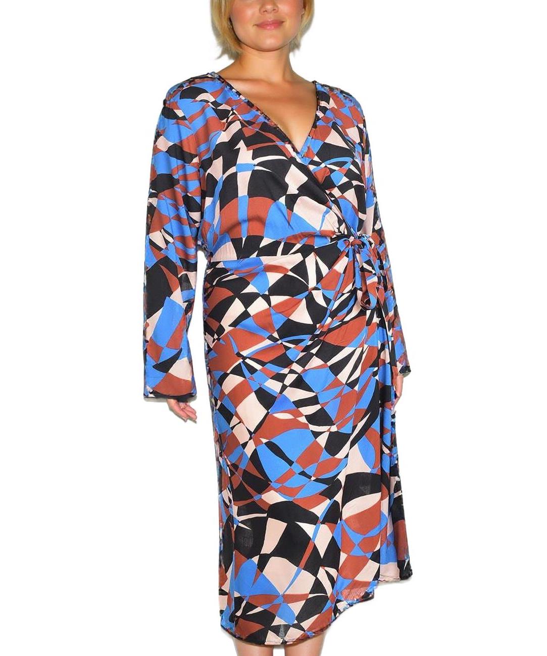 Елегантна рокля от вискоза с изящен геометричен принт в синьо, керемидено, черно и крем. Прегръщаща кройка с V-деколте, дълги ръкави и регулиращ се колан за удобство и женствен силует. Идеална за ден.