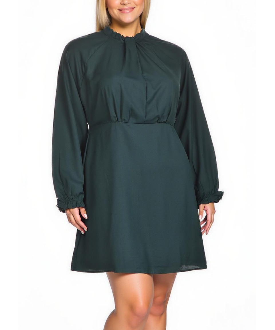 Елегантна тъмнозелена рокля с висока яка, дълги ръкави с ластични ръкавици и нежни къдрички на маншетите. Вталена талия, къса дължина до коляното, подходяща за офис и празнични поводи. Стилна и нежна!