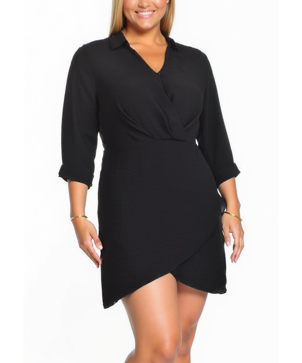 Елегантна черна рокля с V-деколте и яка, 3/4 ръкав и оформена талия. Асиметрична къса пола придава модерна нотка. Подходяща за офис, коктейл и вечерни изяви. Удобна и стилна. Перфектна за всеки повод.