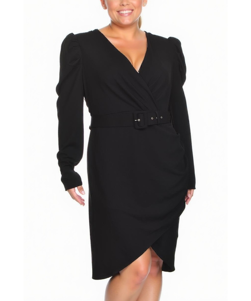 Елегантна черна рокля с V-образно деколте, драпирана предна част и колан с тока. Дълъг ръкав с леко набиране на рамото, прилепнала талия и ефектна асиметрична пола — идеална за официални поводи. 2025