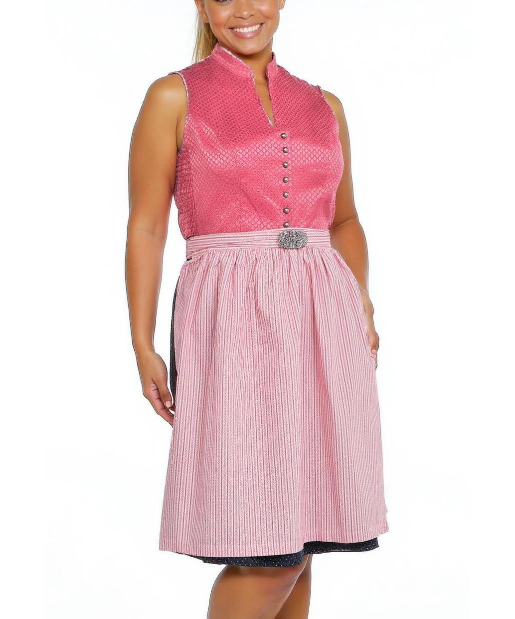 Немска дирндл рокля от 100% памук: розов корсет с декоративни копчета, райета престилка и класическа талия. Удобна, дишаща и стилна за празници и ежедневие. Лесна поддръжка, висококачествена изработка.