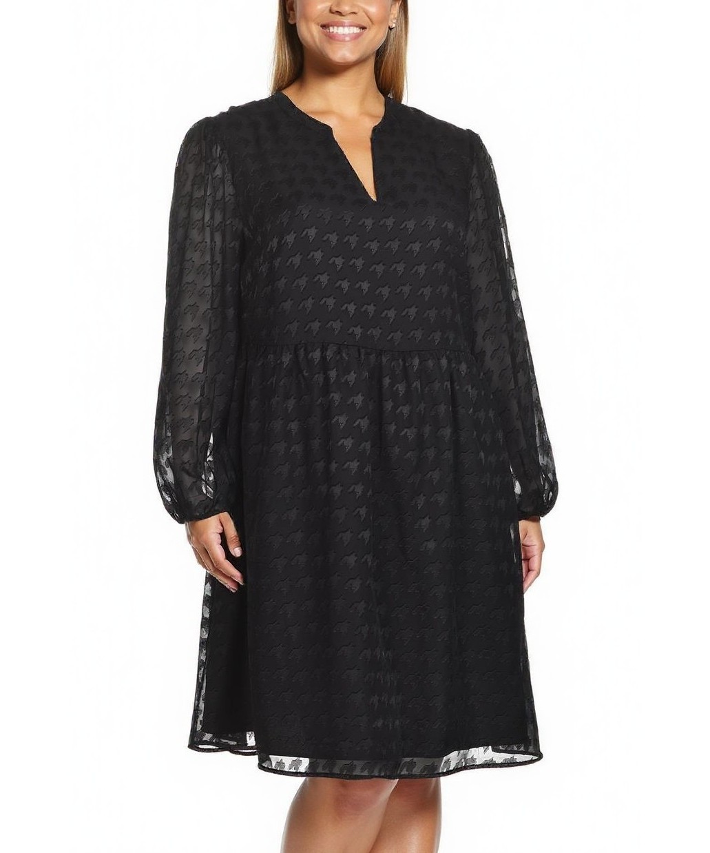 Елегантна черна рокля до коляното от ефирна шифонова материя с дискретен релефен десен. Свободна кройка, дълги прозрачни ръкави с маншет, V-образно деколте — идеална за официални и ежедневни случаи.!