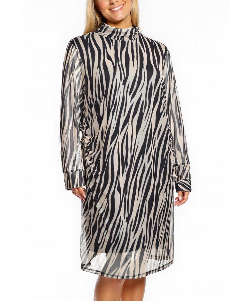 Миди рокля с ефектен зебра принт, полупрозрачен шифонен слой, дълги ръкави и надигната яка с къдри. Свободна кройка, подходяща за официални и ежедневни визии, лесна за поддръжка. Възможност за коланXL