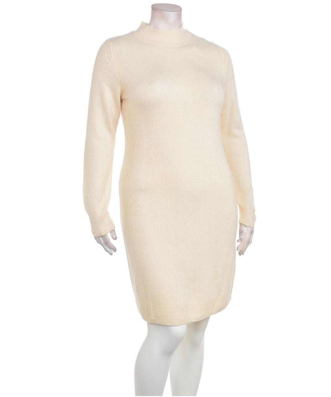 Елегантна плетена рокля в кремаво, със свободна линия, дълги ръкави и висока поло яка. Мека, топла материя с рипсен подгъв и маншети. Идеална за ежедневно и офис облекло. Стилна и мека за студени дни.