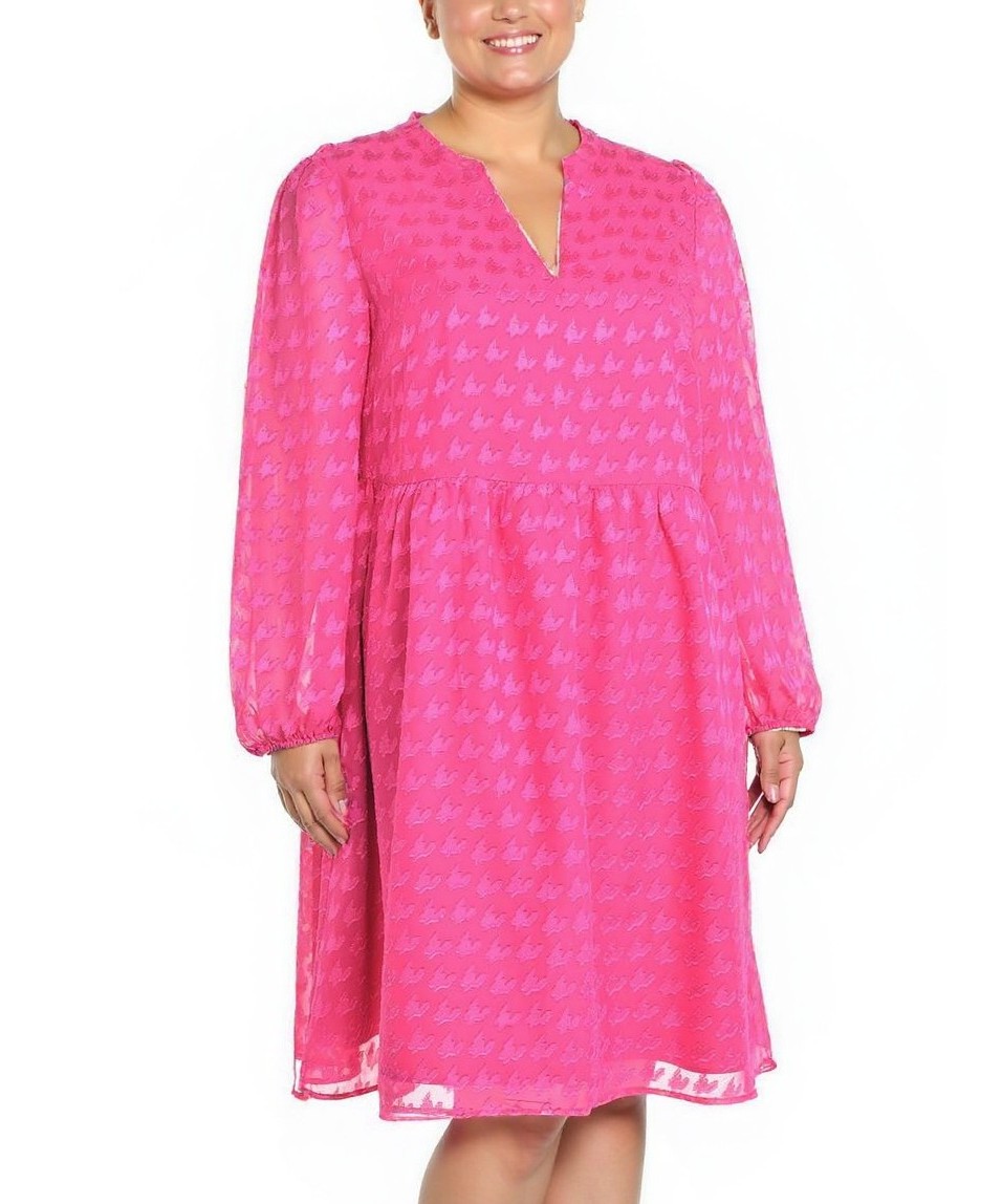 Ярко розова свободна рокля до коляното от лек шифон, с V-образно деколте, дълги обемни ръкави с ластик и ефектна деликатна шарка. Удобна, женствена и подходяща за всеки ден. Перфектна за всеки ден!!!