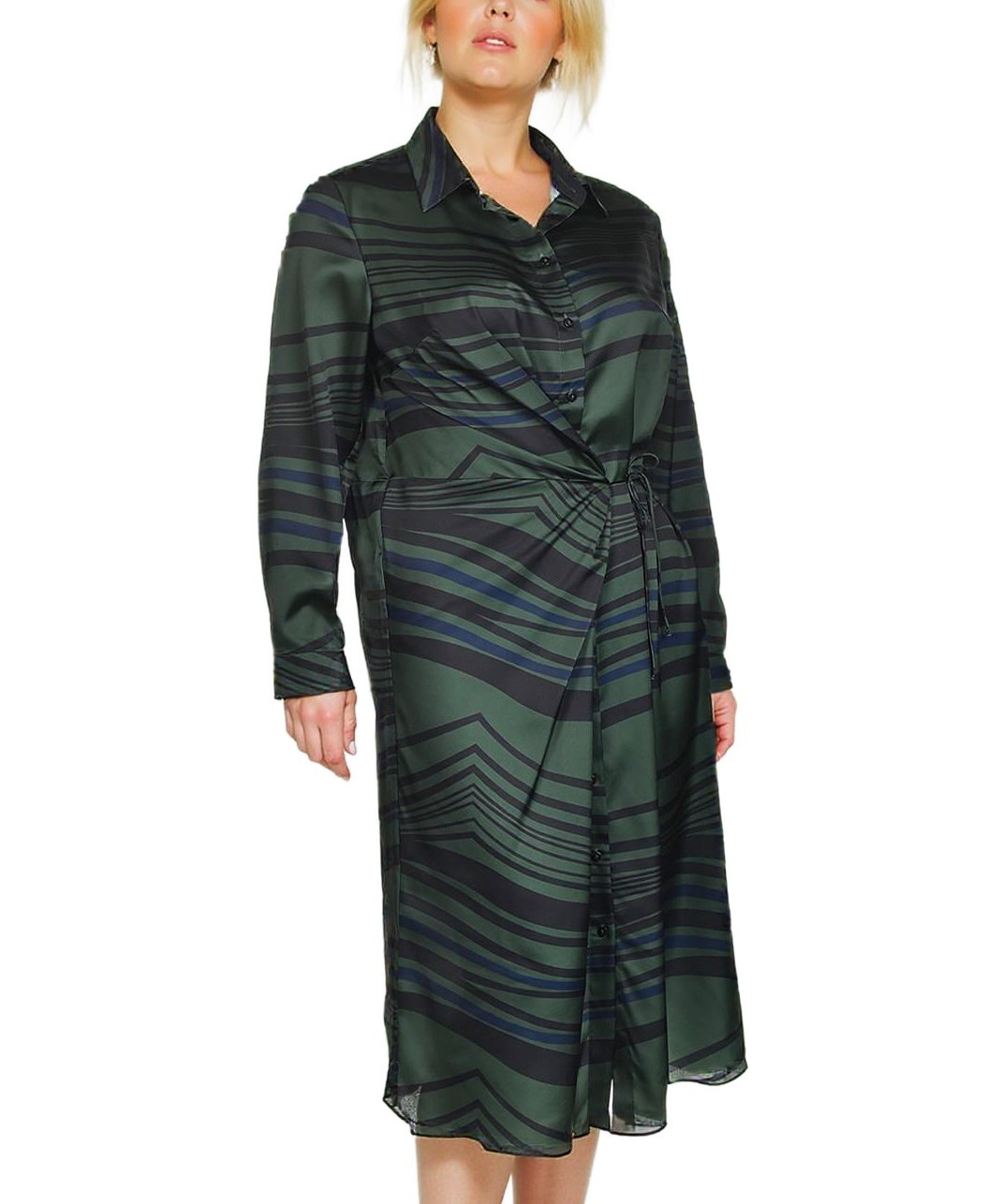 Елегантна миди рокля риза от сатенен плат в тъмнозелено с геометрични черни и сини ивици. Дълги ръкави, яка, копчета отпред и колан за оформяне на талията. Универсална и стилна. Подходяща за всеки ден.