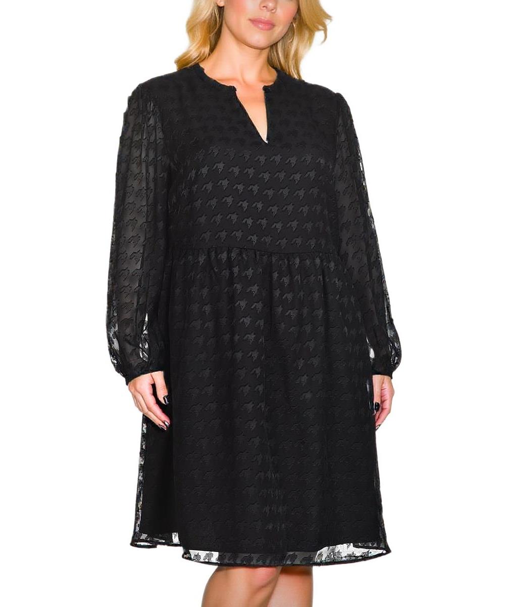 Елегантна черна миди рокля от лек шифон с дискретен релефен десен. Свободна кройка с висока талия, V-деколте и дълги прозрачни ръкави за стилна вечерна или офис визия. Подходяща за специални поводи.