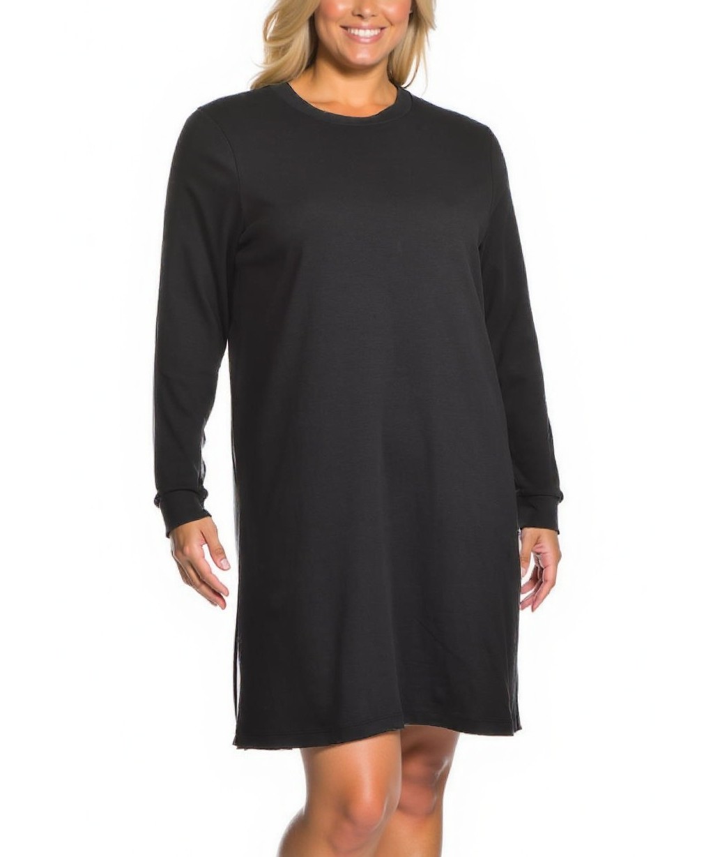 Рокля от 100% памук в черно, с прав, свободен силует и дълги ръкави. Кръгло деколте, странични цепки и мека, дишаща материя. Идеална за всекидневен комфорт и лесна поддръжка. Подходяща за всеки повод.