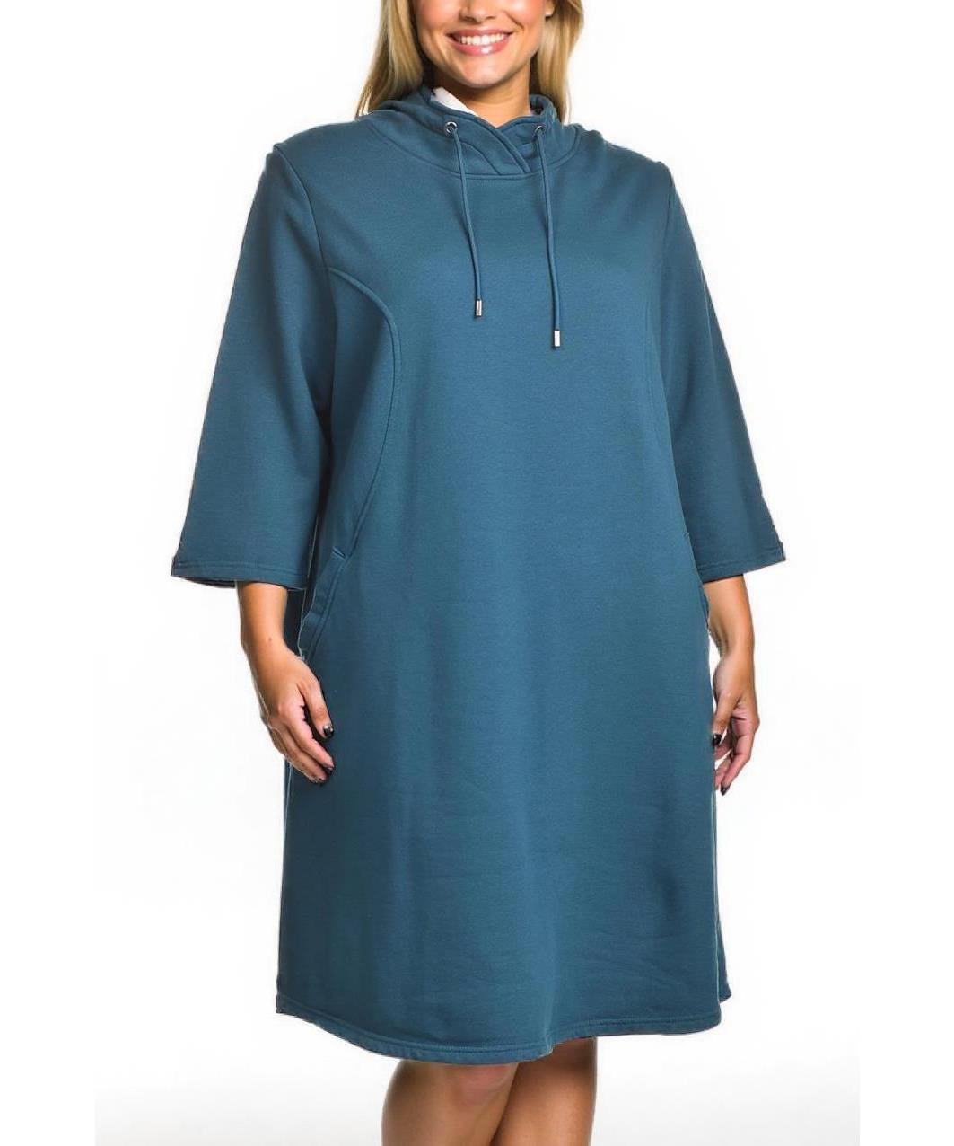 Комфортна памучна рокля в тюркоазено, свободен силует, качулка с връзки, 3/4 ръкави и дискретни джобове. Мека, дишаща материя – идеална за ежедневие и свободно движение.