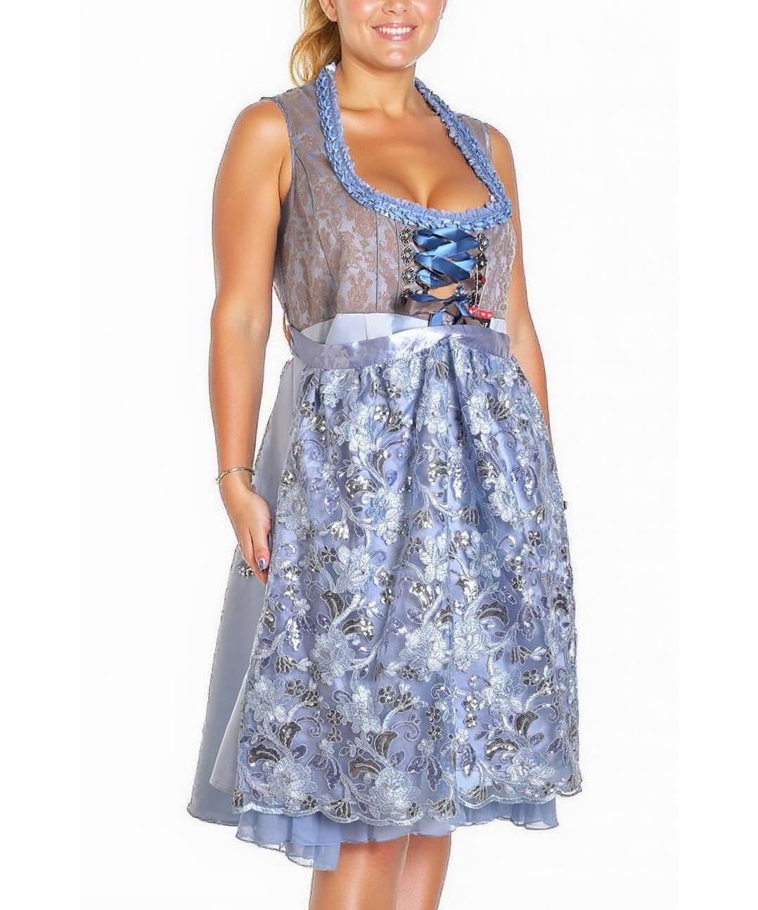 Елегантна немска дирндл рокля от памук в светлосиньо със флорална бродерия и дантелена престилка. Корсет с връзки, подчертана талия и мека подплата за удобство и традиционен стил. За празници и парти.