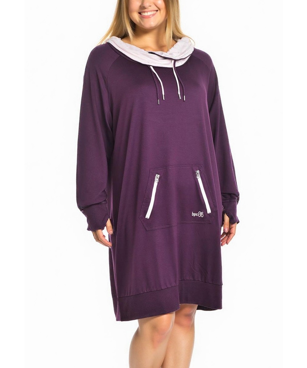 Ежедневна рокля от вискоза в тъмно лилаво с мека качулка в контрастен светъл нюанс, удобни дълги ръкави и преден джоб с ципове. Свободна, приятна на допир и лесна за поддръжка. Модерен спортно-елегантен