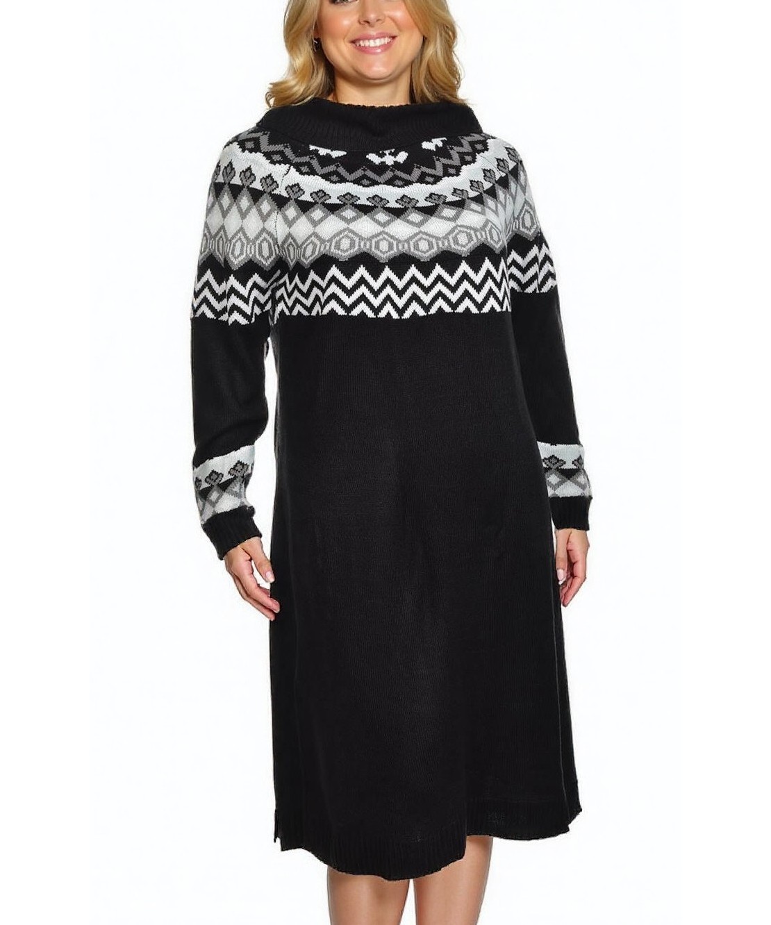 Черна плетена рокля с дълги ръкави и огъващ се поло-отвор. Декорирана с ефектен бял и сиво-черен феър айл десен в горната част и на маншетите. Удобна, топла и елегантна. Подходяща за всеки ден, офис