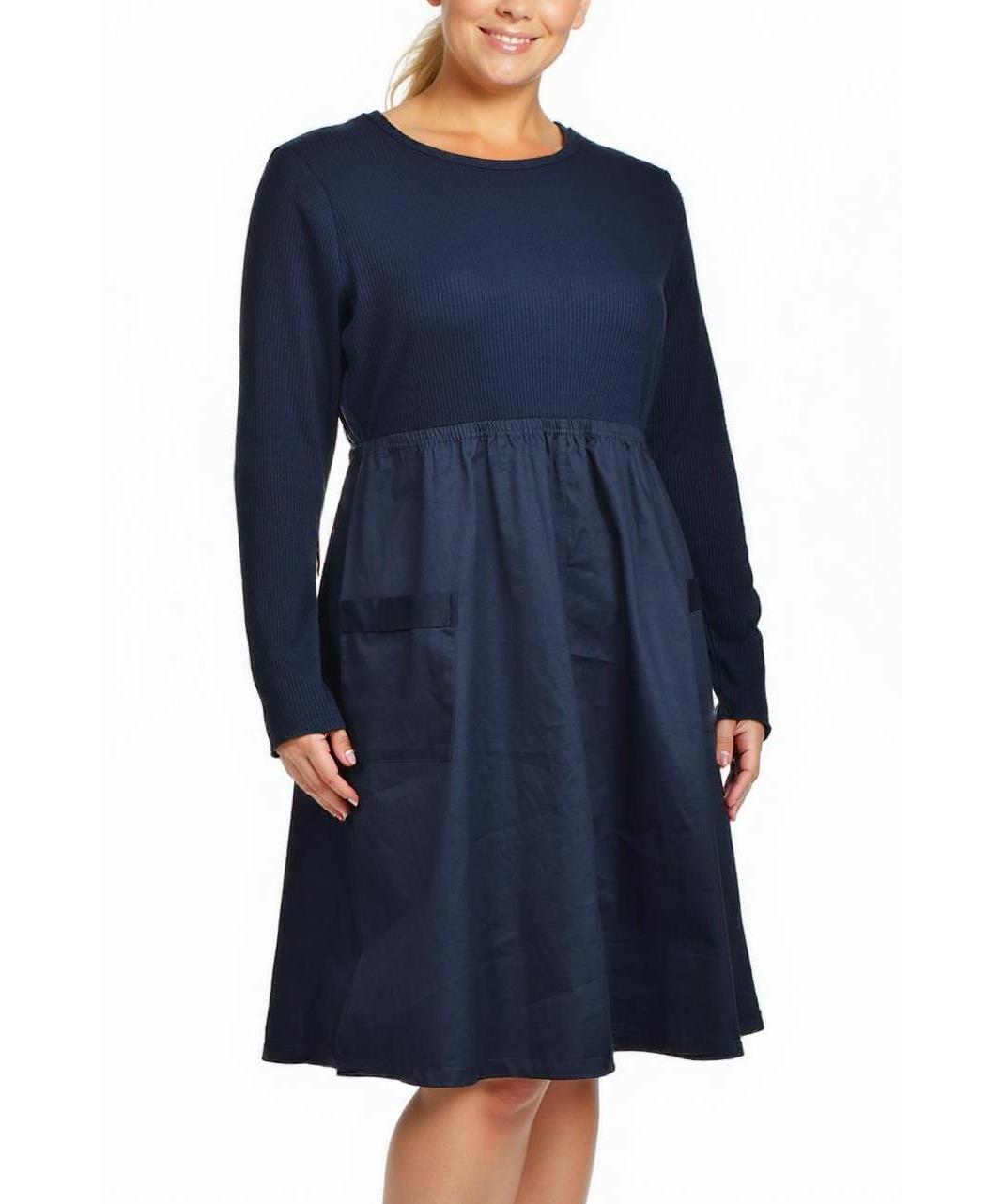 Елегантна тъмносиня рокля от вискоза с дълги ръкави и свободна А-линия. Мекият, дишащ плат предлага комфорт, практични джобове и универсален силует – идеална за ежедневие и по-официални поводи. вечер.