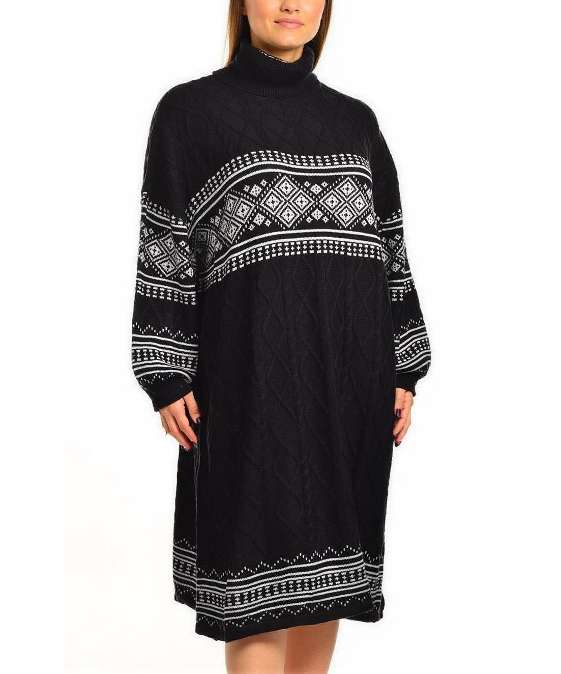 Елегантна плетена рокля тип пуловер в тъмно черно с бяло геометрично орнаментиране. Висока поло яка, дълги набрани ръкави и свободна линия за уют и стил през студените сезони. Подходяща за офис. Зима.