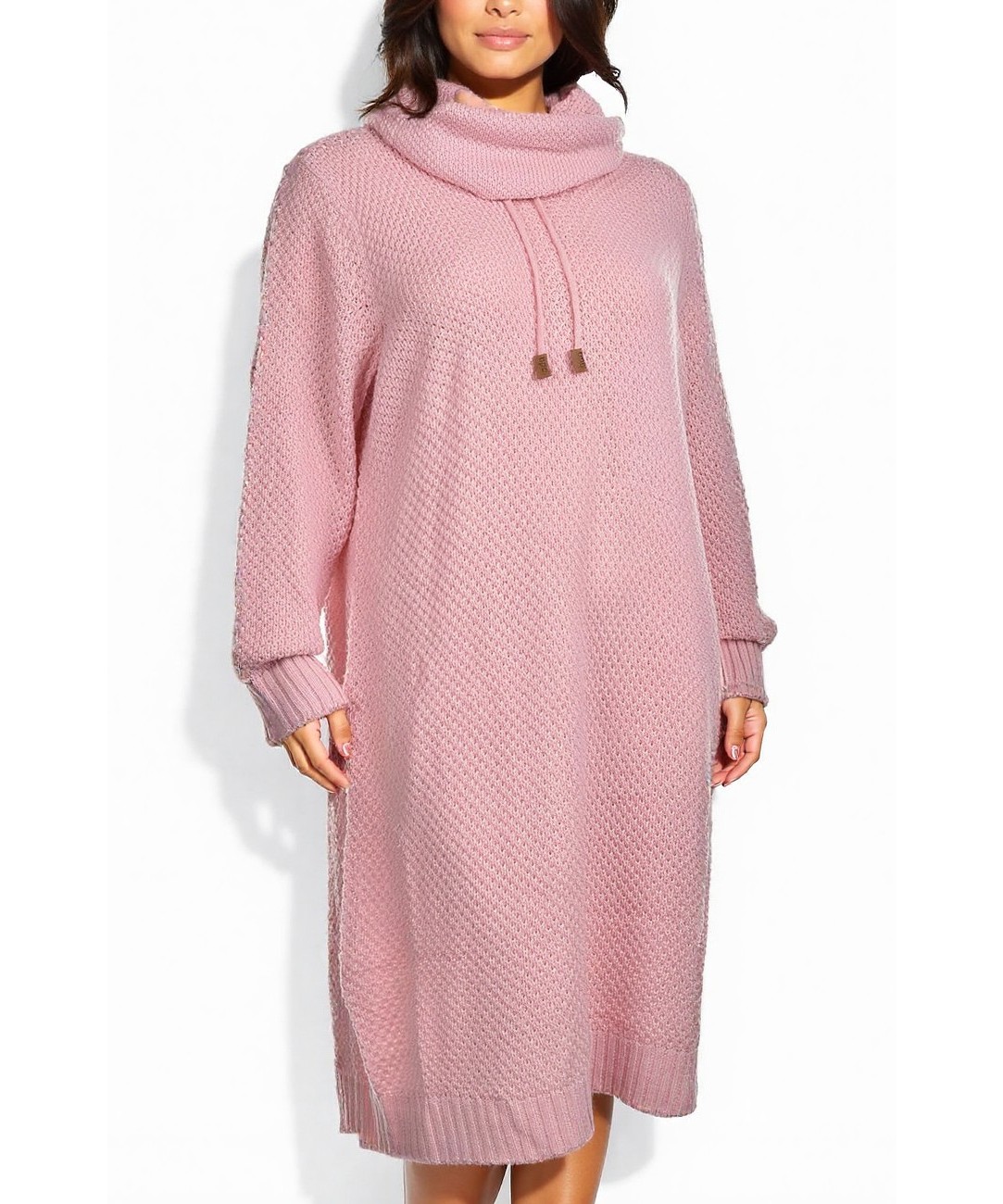 Розова плетена рокля тип пуловер с голяма шал-яка и връзки, дълги ръкави, рипсни маншети и подгъв. Мека, топла текстура, свободна кройка до коляното – елегантна и уютна за всеки ден. За всеки повод.!!