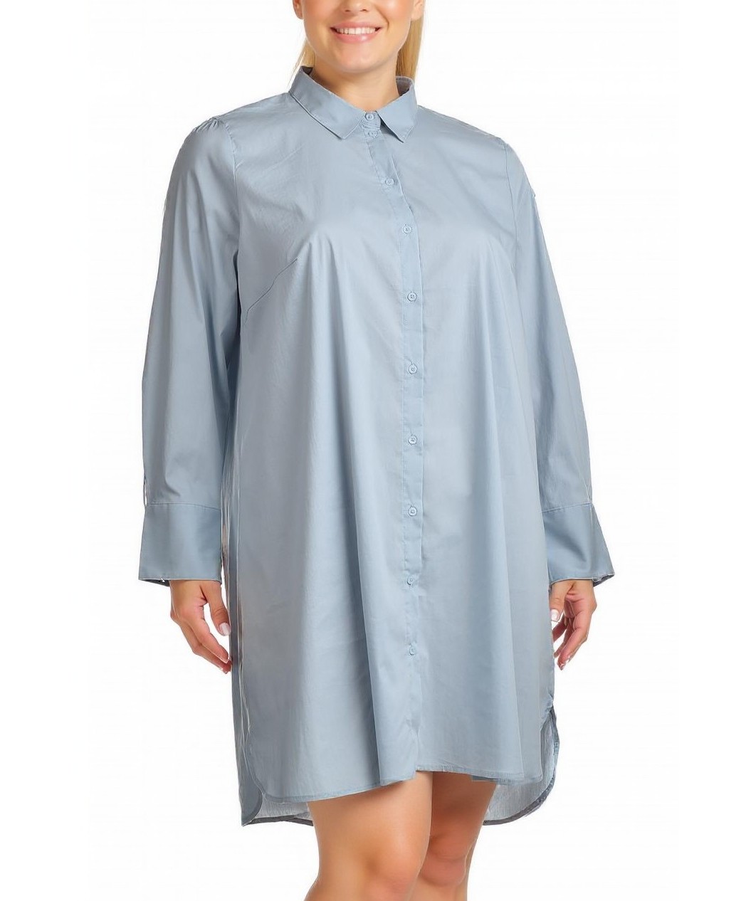 Светлосиня памучна рокля-талия без колан, риза стил с яка и копчета, дълги ръкави и дискретни цепки встрани. Свободна кройка, мека и дишаща материя за всеки ден. Идеална за офиса и ежедневието лесно.