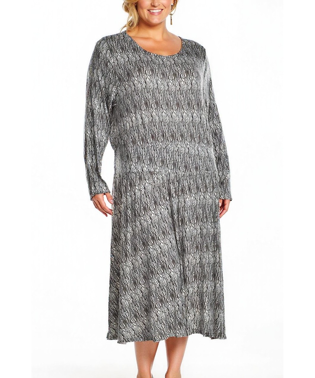 Елегантна рокля от вискоза с дълъг ръкав и кръгло деколте. Миди дължина и свободен силует с абстрактен монохромен десен. Мека, дишаща и удобна за ежедневно или офис носене. Машинно пране, лесна грижа.