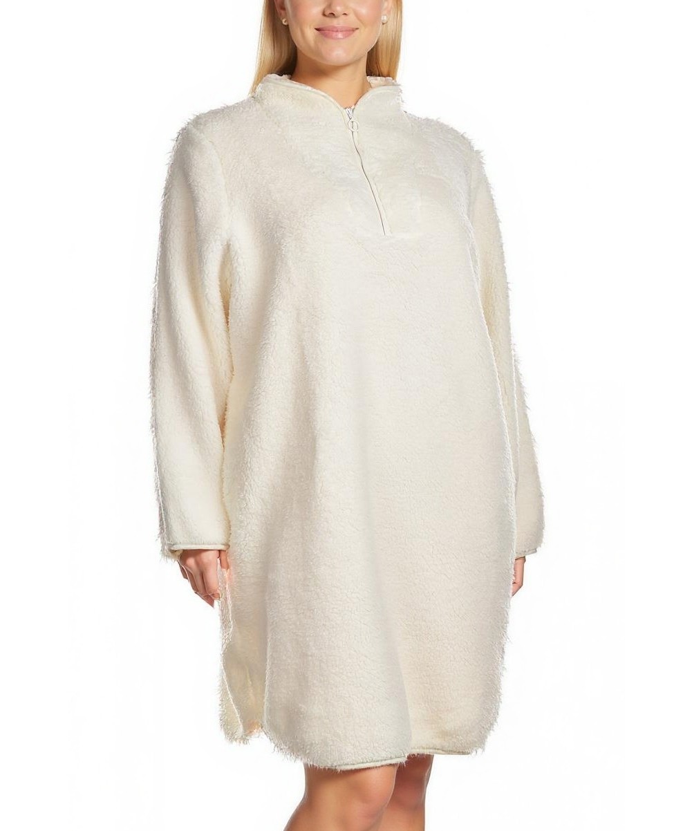 Ежедневна пухена рокля-туника в кремаво, от мек плюш. Свободен, нощен силует до коляното с дълъг ръкав и половин цип. Идеална за домашен комфорт и зимни релаксирани визии. Подходяща за подарък. уютна.