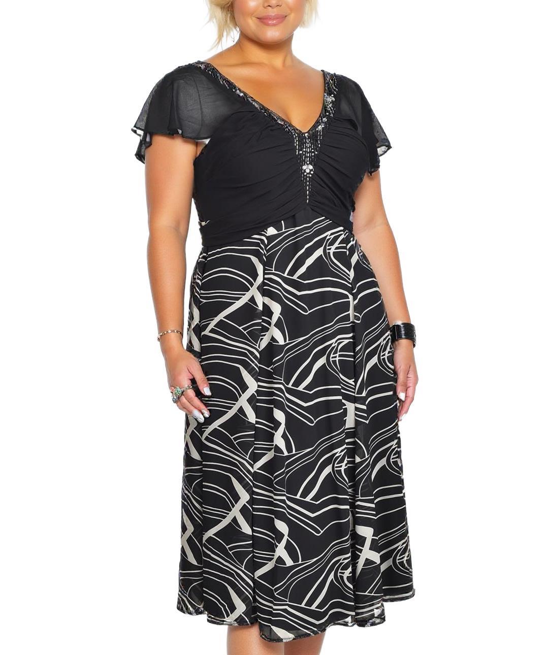 Елегантна рокля с черен горен и плисиран V-образен дизайн с блестящи акценти. Долната част е разкроена с черно-бели абстрактни шарки. Късите ръкави и платът създават стилен и женствен силует.