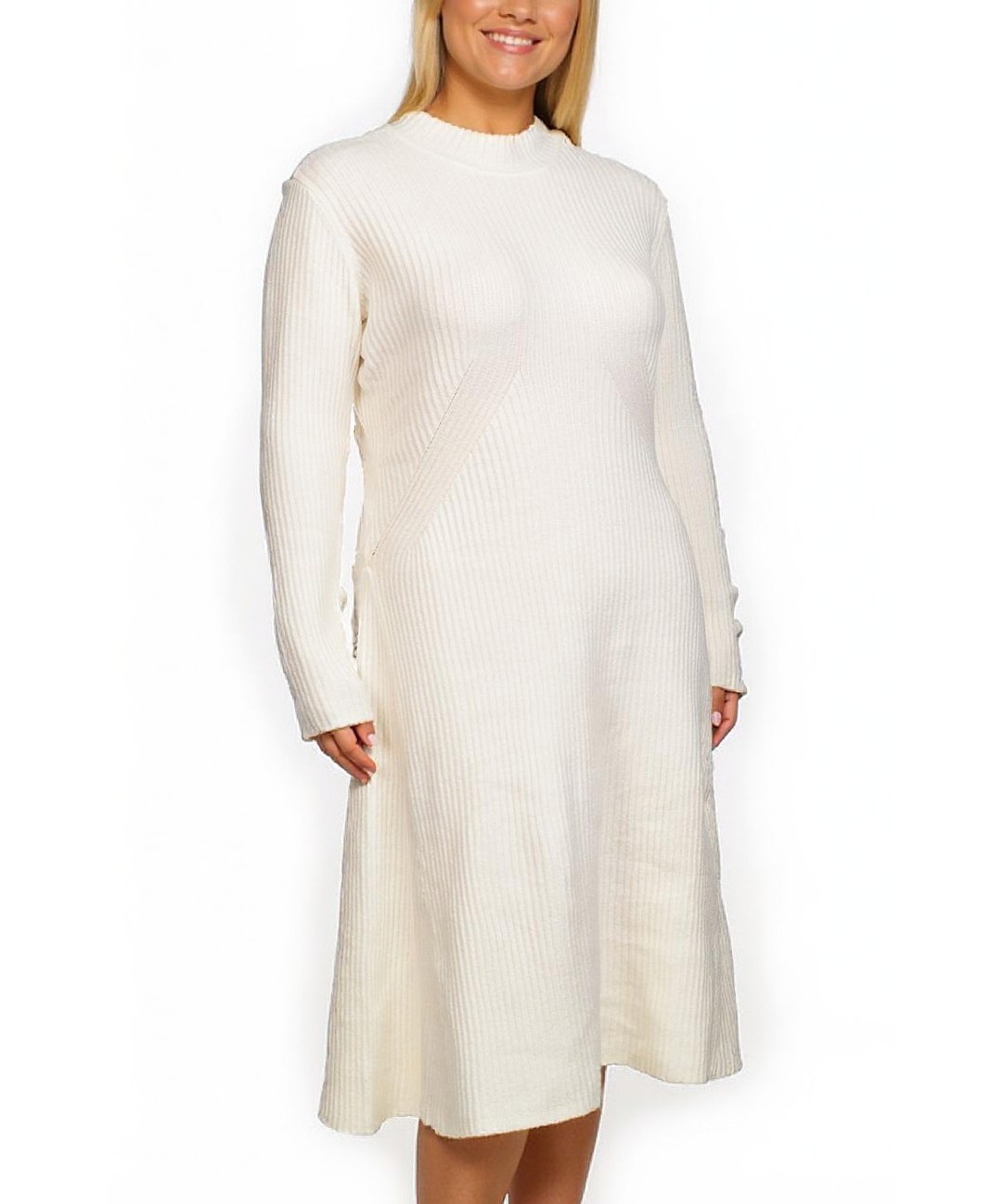 Елегантна плетена рокля в кремав цвят, midi дължина, издължен силует с фини рипсени линии. Дълги ръкави, висока яка и странични декоративни копчета за стил и уютен комфорт. Идеална за студено време!!