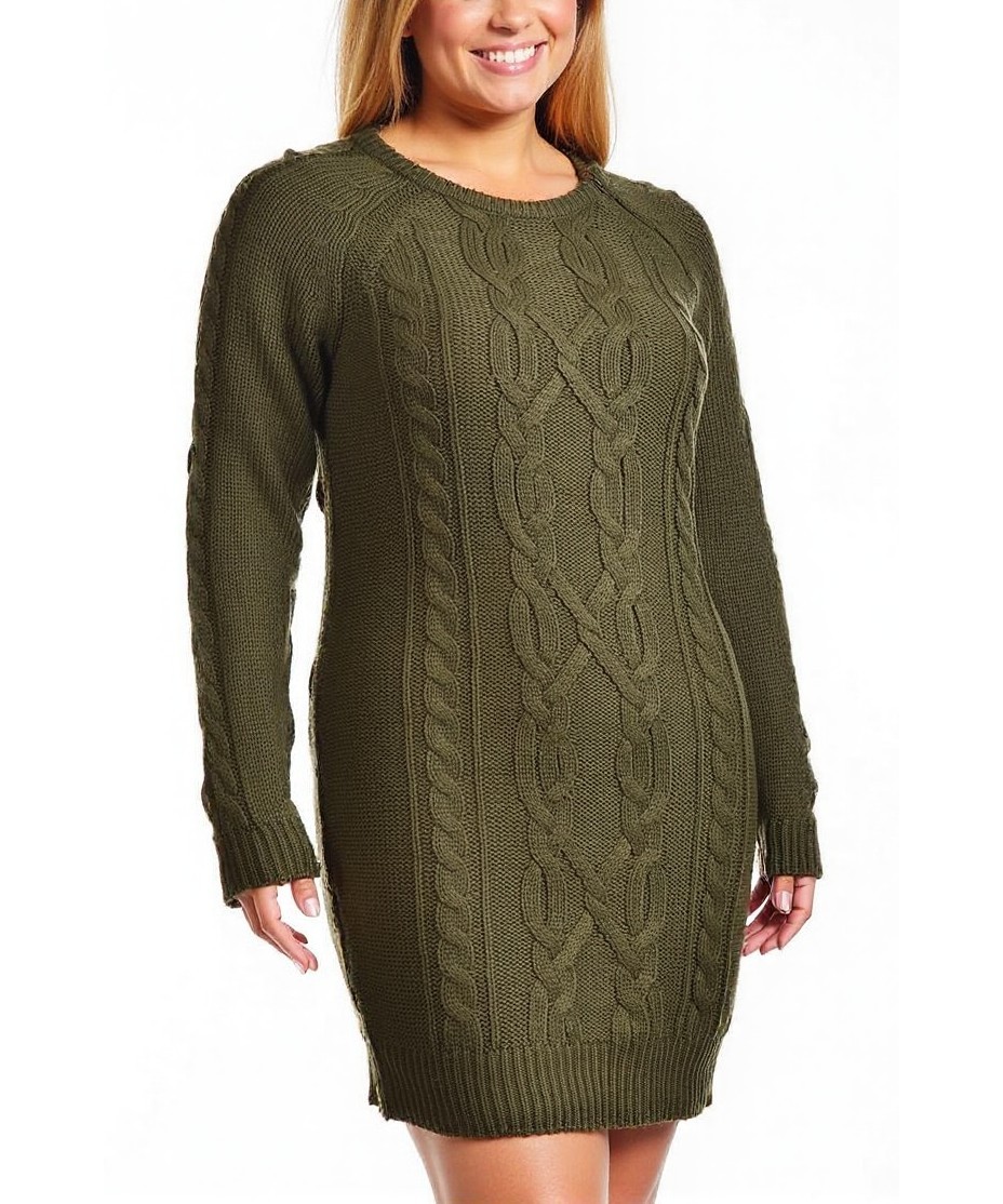 Плетена рокля-вълна в маслиново, с обло деколте и дълги ръкави. Дизайн с изразителни оплетки отпред, рипс в долния край и маншети. Топла, удобна и стилна за всекидневие и работа. Подходяща за вечерта.