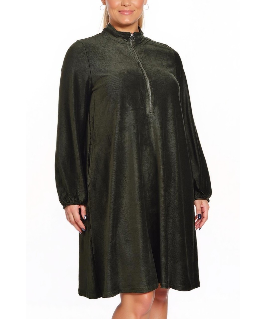 Елегантна кадифена рокля в тъмнозелено, свободен прав силует, дълъг ръкав с ластик, права дължина до коляното и декоративен цип на деколтето. Удобна и стилна за всеки ден. Перфектна за офис и вечеря.