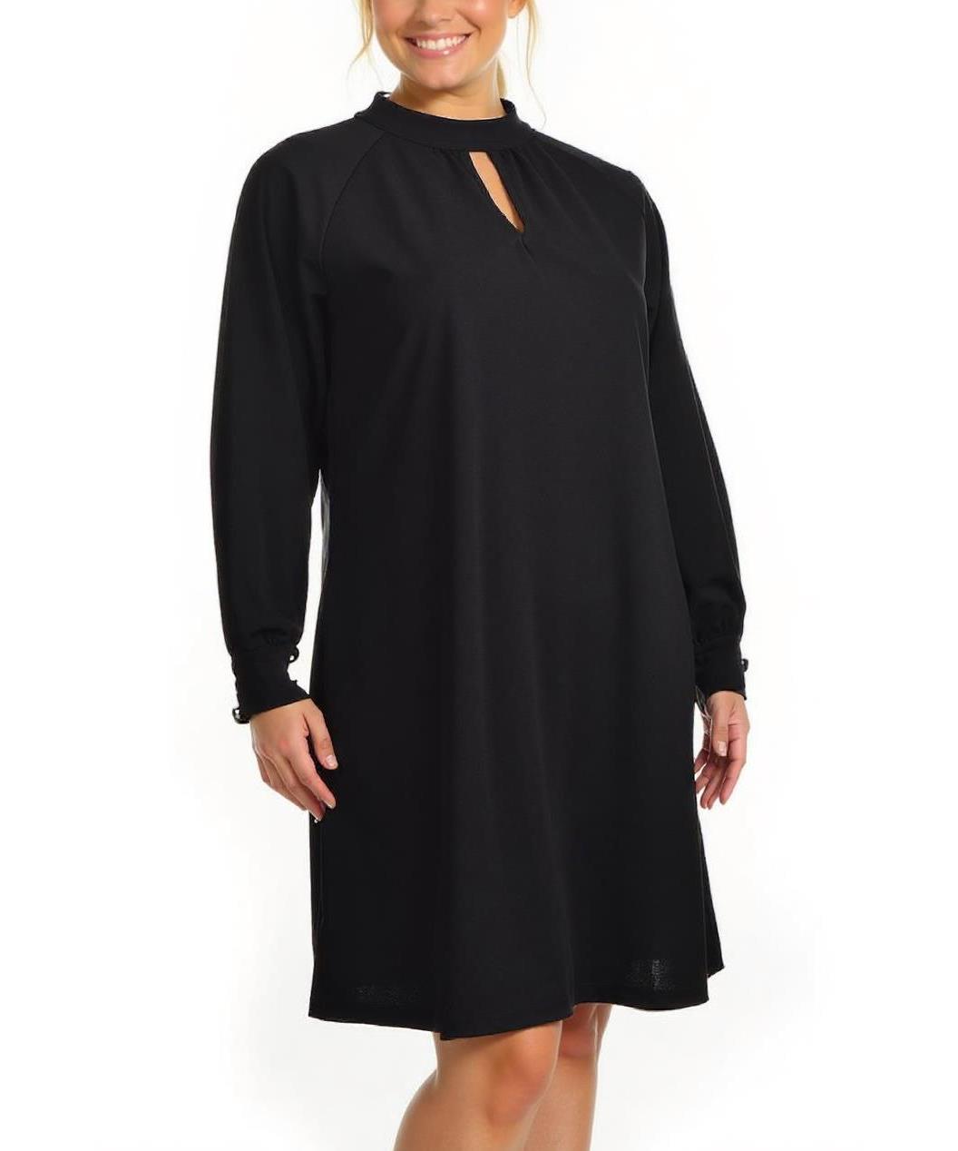 Елегантна черна рокля до коляното с дълги ръкави, изчистен А-линеен силует и малък прав крой с капковиден отвор на деколтето. Подходяща за офис и официални поводи. Фин, еластичен плат за всеки стил