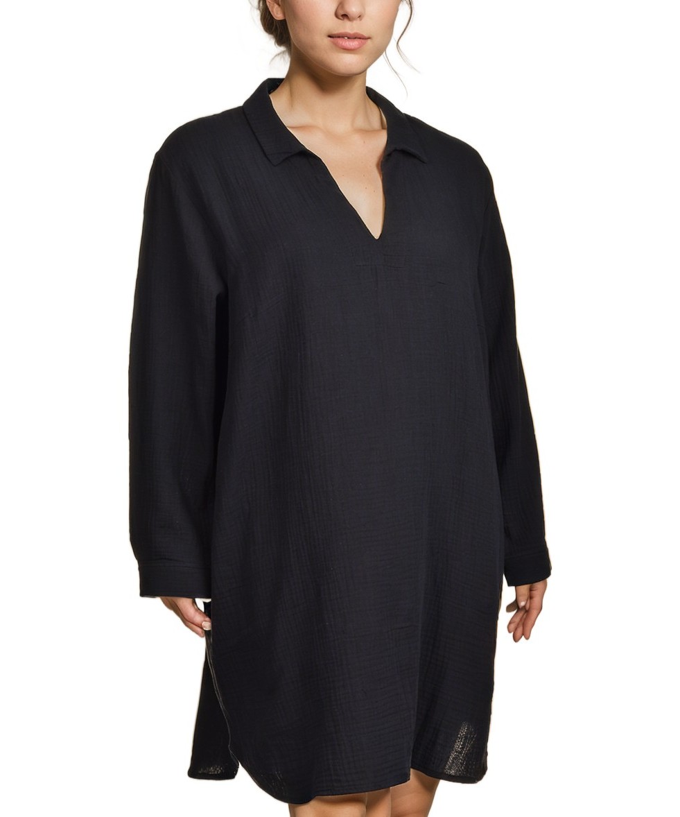 Ежедневна памучна рокля в тъмен цвят с V-образно деколте и яка. Свободен силует, дълги ръкави и комфортна дължина над коляното. Лека, дишаща и лесна за поддръжка — стилна и удобна. Идеална за всички дни
