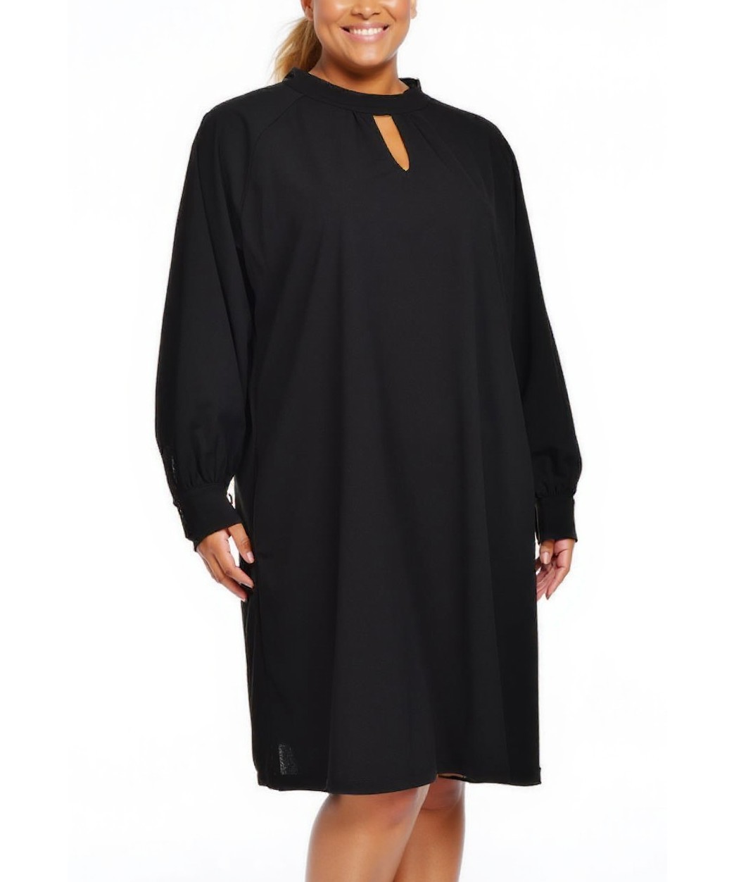 Елегантна черна миди рокля с прав силует, обемни дълги ръкави с маншети и ефектно капковидно деколте. Удобна и стилна, подходяща за всеки повод. Лесна за поддръжка; комфортна, удобна за всички случаи.