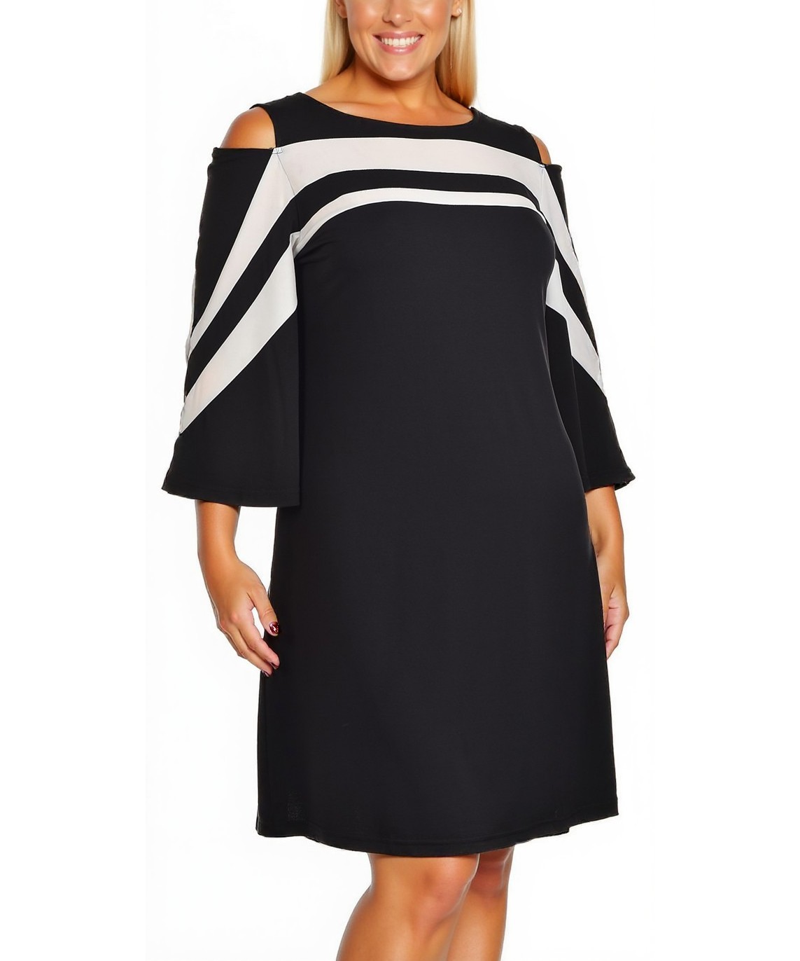 Елегантна черна рокля с прав силует и дължина до коляното. Кръгло деколте, открити рамене и разкроени ръкави 3/4. Контрастни бели ленти създават линия. Подходяща за офиса и вечерни поводи. Елегантна.