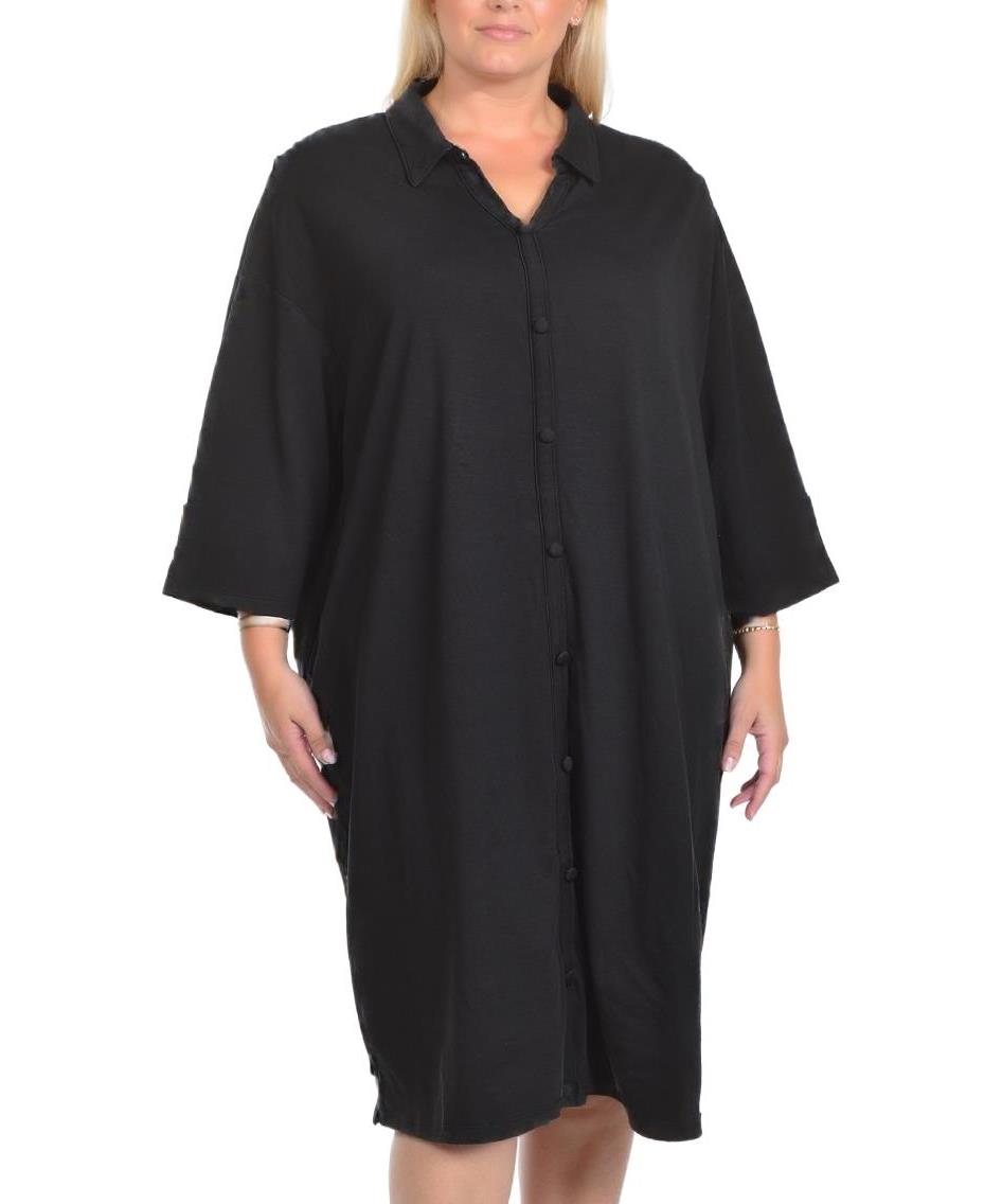 Черна свободна рокля с копчета, дълги ръкави и ревер. Подходяща за ежедневна употреба, комфортна за носене. Универсален модел, идеална за различни поводи, придаващ стил и елегантност.