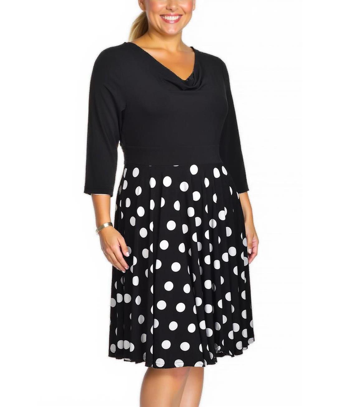 Елегантна черна рокля тип фит енд флар с 3/4 ръкави и мека водопадна деколте. Долна част с черно-бял полка точка принт, свободна пола до коляното. Комфорт и стил в едно. Подходяща за офис....!!!!!!!!!