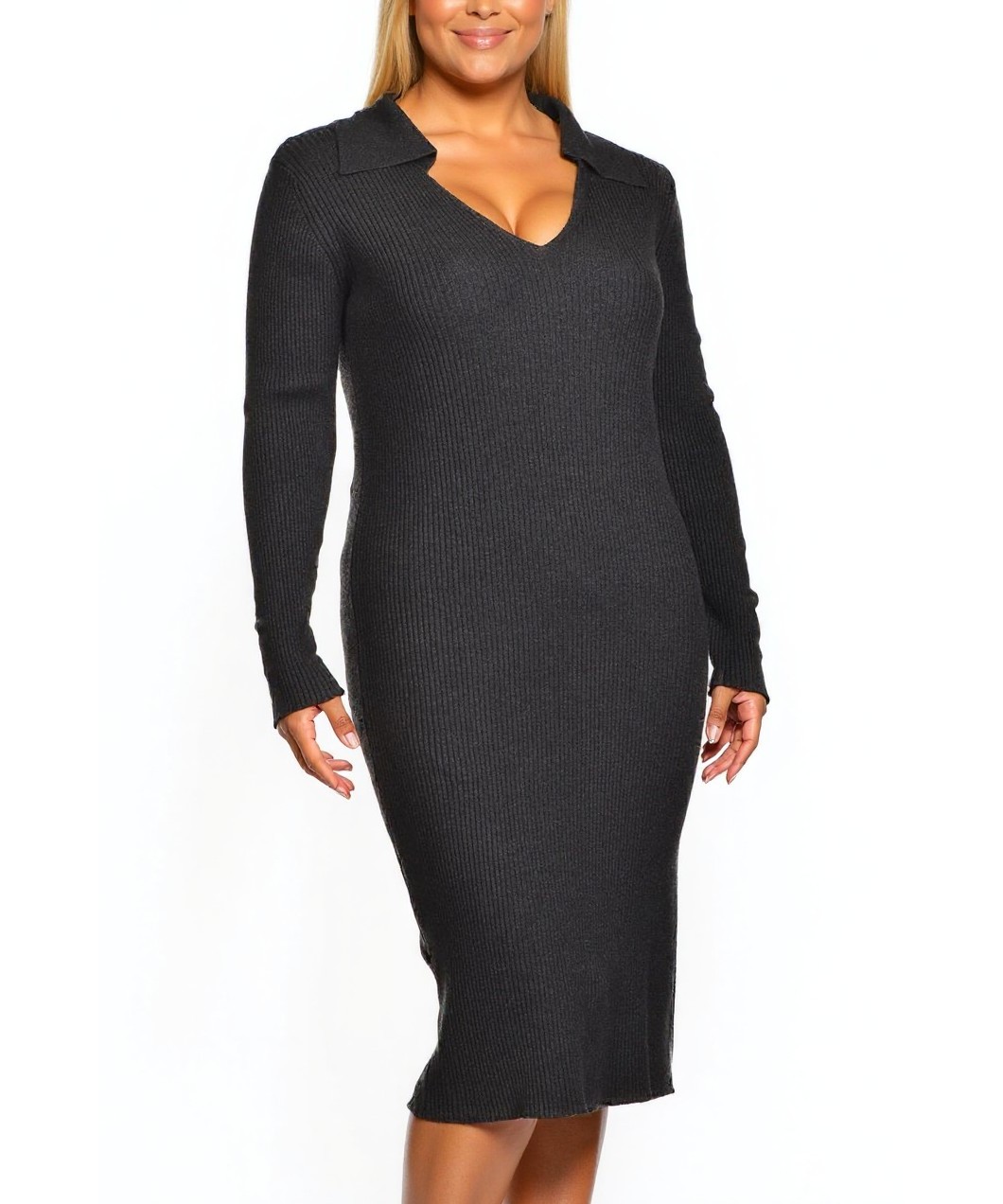 Елегантна вталена рокля от вискоза с фино ребристо плетиво, дълги ръкави и V-образно деколте с яка. Миди дължина, еластична и мека на допир, идеална за ежедневен и празничен тоалет. Лека грижа и стил.