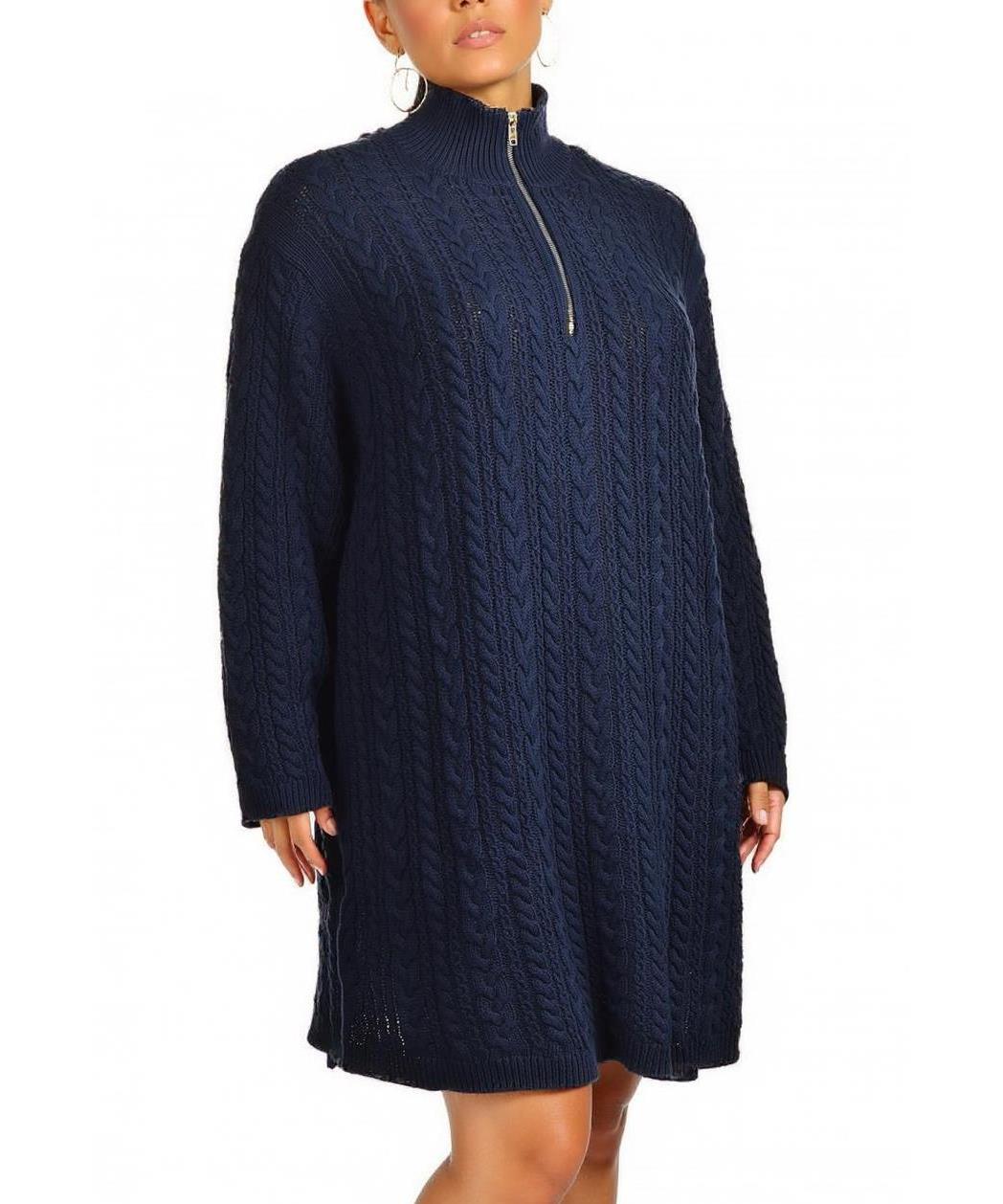 Тъмносиня рокля от памук с плетен ефект и цип по деколтето. Свободна линия, дълги ръкави и средна дължина. Удобна, топла и стилна за всекидневно носене през хладните дни. Идеална за офис и уютни вечери