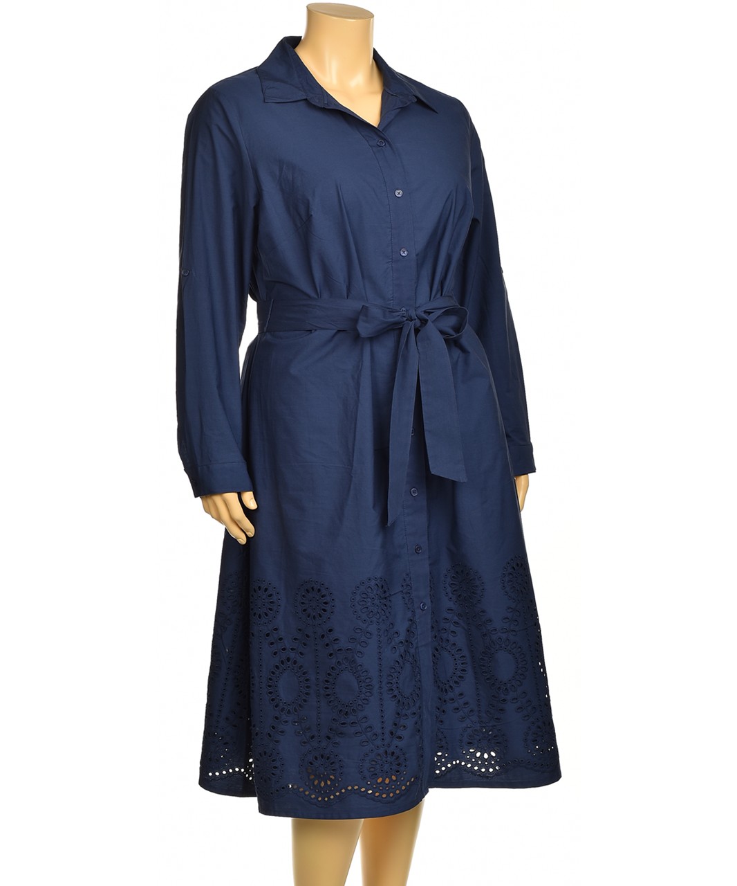Елегантна памучна рокля в тъмносиньо с яка и бутонен преден затвор, дълги ръкави и ефектен колан за връзване. Нежна бродерия в долната част, удобна, дишаща и подходяща за всеки ден. Лесна за поддръжка.