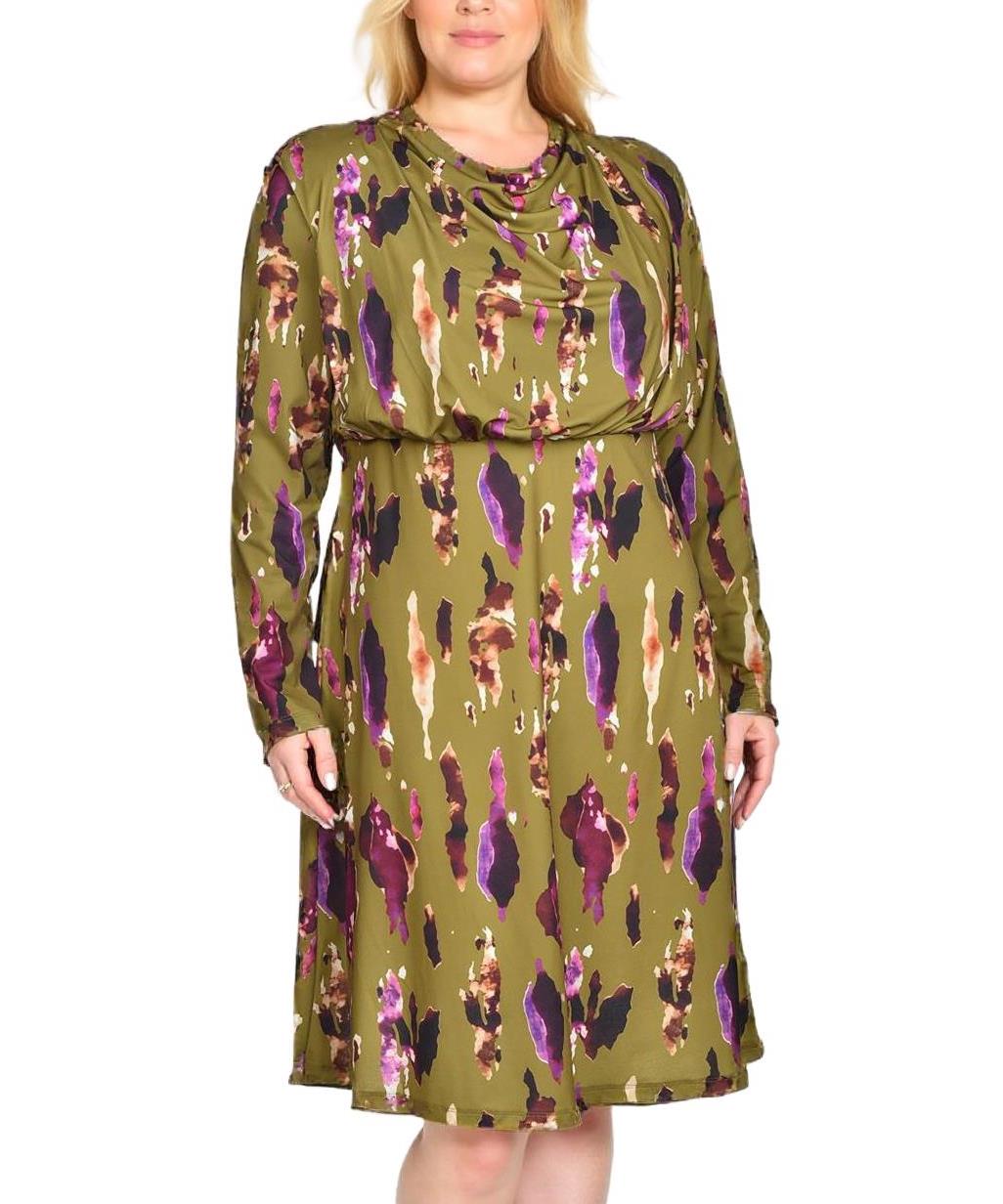 Стилна рокля със свободна кройка и дълги ръкави. Основа в маслиненозелен цвят с абстрактни мотиви в лилаво, кафяво и бяло. Изработена е с надиплена предница за елегантен акцент. Идеална за ежедневно носене.