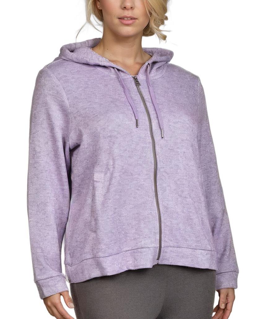 Лилав суичър с качулка и цип, изработен от мек материал. Суичърът има джобове и дълги ръкави, комбиниран със сиви панталони, идеален за ежедневно носене и удобство.