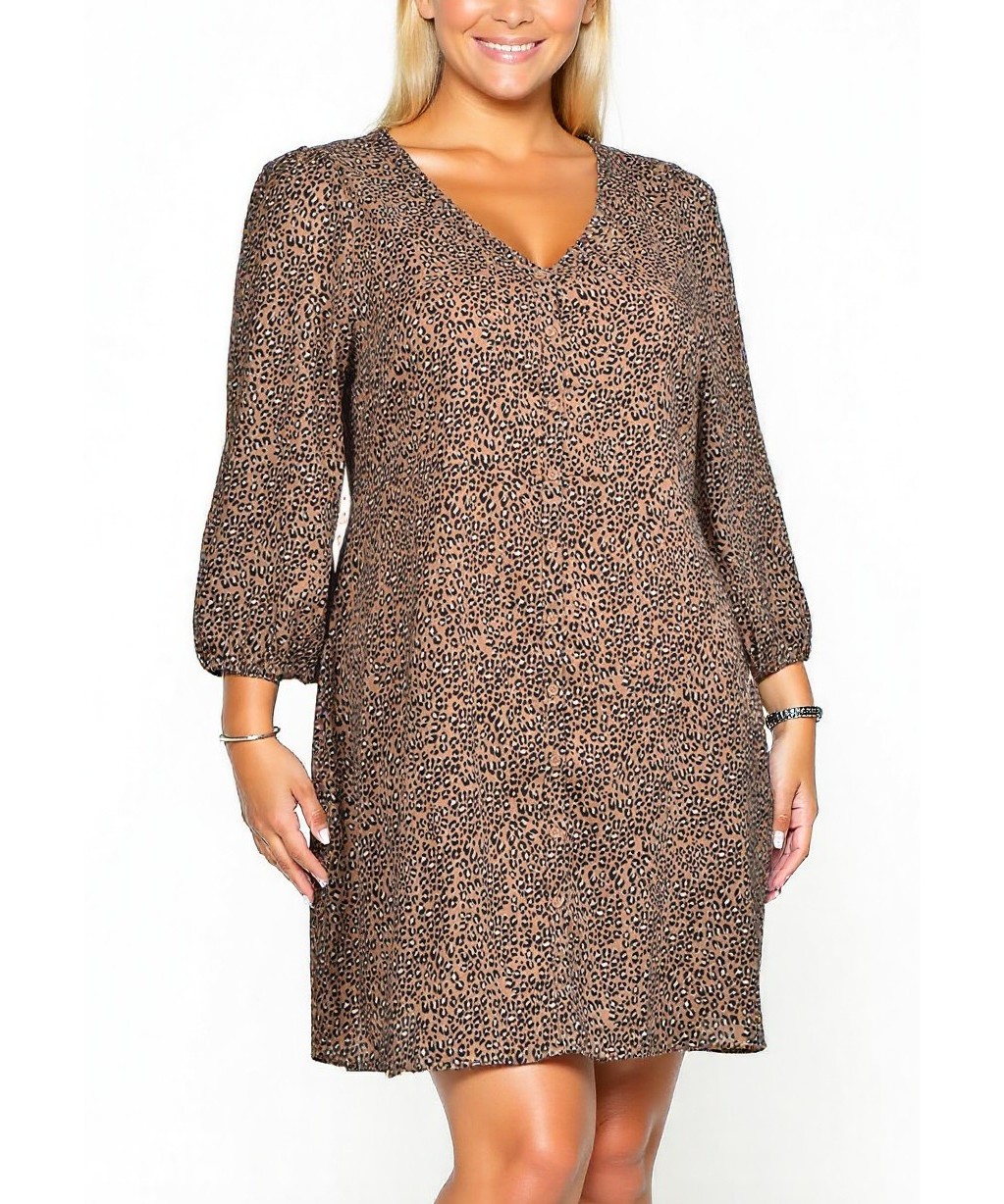 Ежедневна рокля с леопардов принт, V-образно деколте и три-четвърти ръкави. Свободна кройка до коляното, мека, дишаща материя, удобна за всеки ден и офис, лесна за комбиниране. Подчертава женственост.