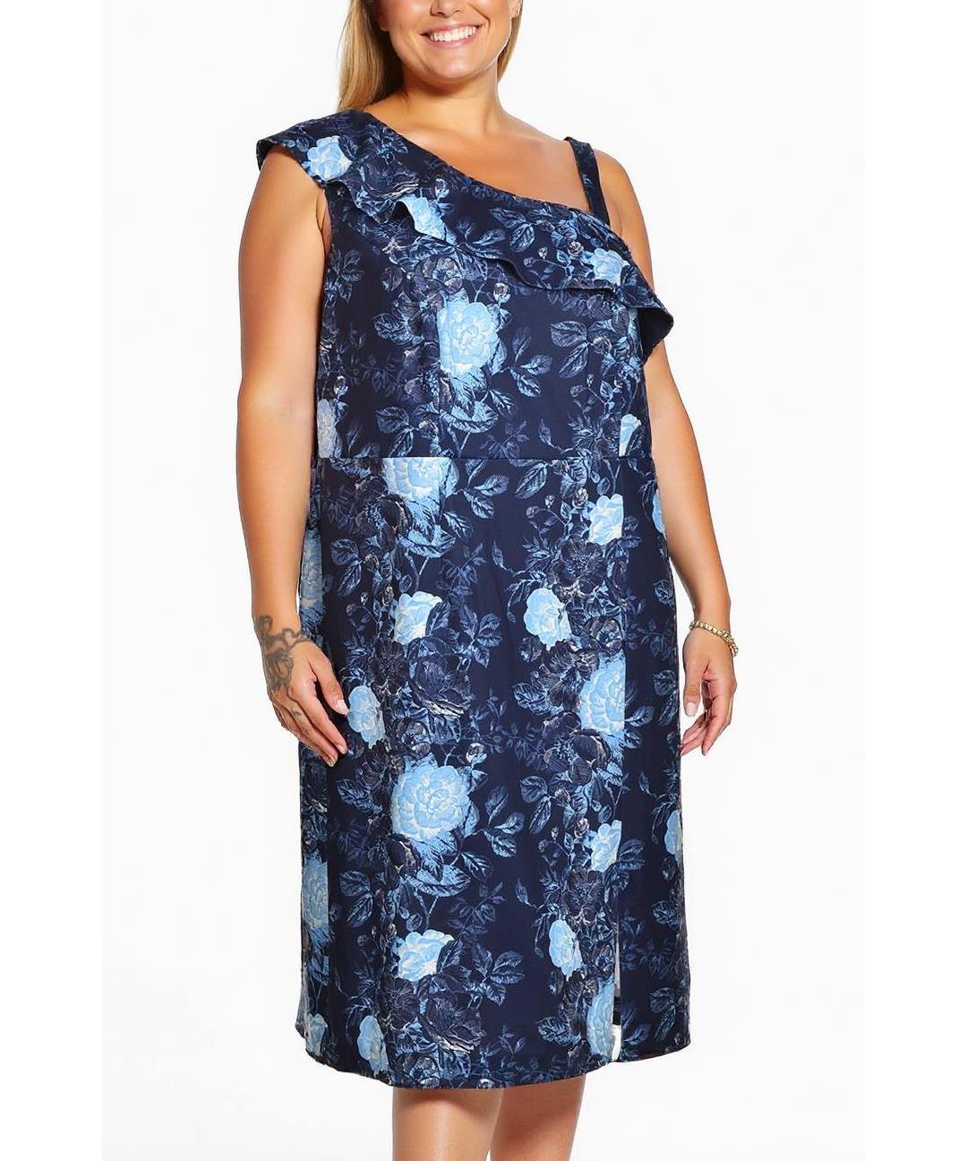 Елегантна рокля от вискоза с флорален мотив в синьо и бяло. Дизайнът включва асиметрично рамо и волан, добавящ изисканост. Подходяща за топли дни и специални поводи, осигурявайки комфорт и стил.